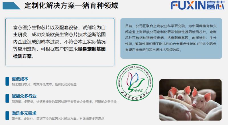 上海富芯医疗科技凭借“AI+生物芯片”技术联合上海市农业科学院畜牧兽医研究所,致力于开发猪育种检测芯片,并推出六大性状种猪育种检测芯片,覆盖遗传疾病、肉质、繁殖性能等核心指标,对种猪遗传缺陷基因进行快速检测以此来实现育种优化。凭借自主研发的智能一体化生物芯片检验测试平台和智能生物芯片检测一体机,实现相比来说较低的检测成本,检测时间缩短至2小时,检测准确率可达99%等诸多优势。